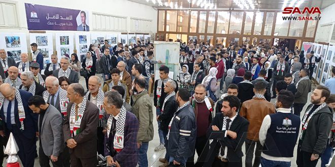 افتتحت اليوم فعاليات معرض طوفان الأقصى الذي ينظمه فرع جامعة حلب للاتحاد الوطني لطلبة سورية في كلية الحقوق.