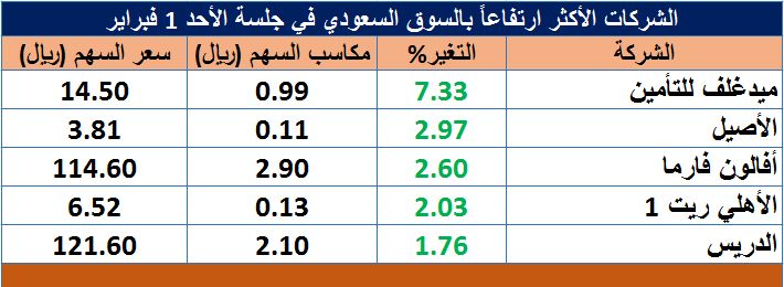وفي المقابل، كان سهم "ميدغلف للتأمين" أبرز الأسهم المرتفعة بنسبة 7.33%، ليغلق عند مستوى 14.50 ريال.