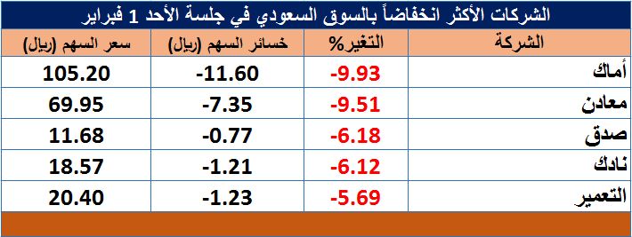 وتصدر سهما "أماك" و"معادن" تراجعات السوق بنهاية جلسة الأحد؛ بخسائر بلغت 9.93% و9.51% على التوالي.