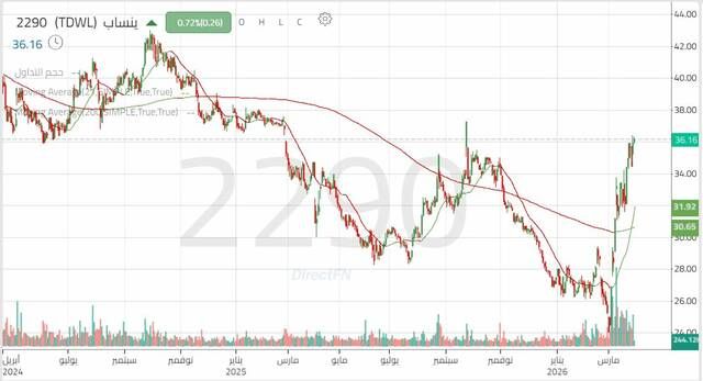 إن نجاح السعر في اختراق هذا المستوى بشمعتين متتاليتين لا تفصلهما شمعة عاكسة يؤيد من فرص الصعود نحو مستوى 36.85 – 37.00. تجاوز هذه المستويات يدفع السعر نحو 37.80 – 38.80 ريال، وفي حال استمرار الزخم الشرائي فستكون المستهدفات التالية نحو 39.50 – 40.45 ريال.