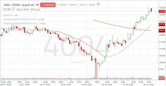 مباشر للأبحاث: تشير الحركة الفنية لسهم دله الصحية إلى اتجاه هابط ثانوي، إلا أن السهم نجح في الارتداد وتجاوز مستوى مقاومة فني هامة عند 131.10 ريال، في تحركات جاءت متوافقة مع رؤيتنا السابقة، حيث ساهم هذا التجاوز في دعم استمرار الصعود نحو مستويات 134.10 – 140 ريالاً.