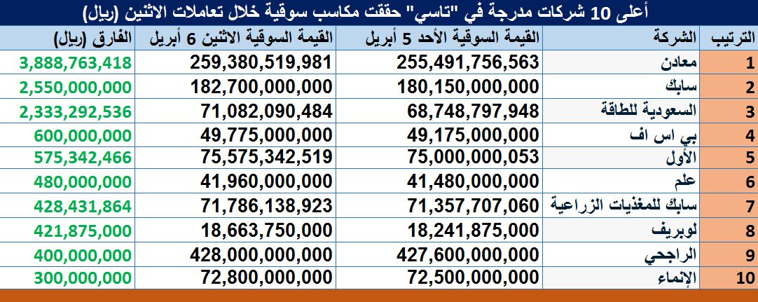 وحققت شركة "معادن" أعلى زيادة في القيمة السوقية بتعاملات اليوم بواقع 3.89 مليار ريال، تليها "سابك" بواقع 2.55 مليار ريال، ثم "السعودية للطاقة" بقيمة 2.33 مليار ريال.