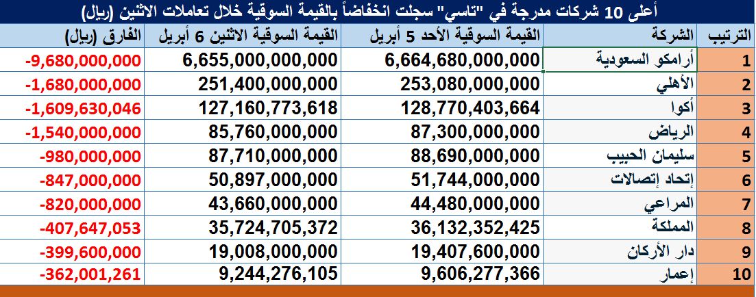 وسجلت "أرامكو السعودية" أعلى انخفاض بالقيمة السوقية في تعاملات اليوم الاثنين؛ بواقع 9.68 مليار ريال، يليها البنك "الأهلي" بتراجع 1.68 مليار ريال، ثم "أكوا" بانخفاض قيمته 1.61 مليار ريال.