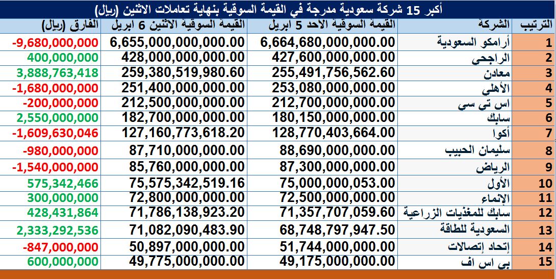 وشهدت قائمة أكبر الشركات السعودية بالقيمة السوقية تباينا بنهاية جلسة الاثنين؛ حيث انخفضت القيمة السوقية لـ"أرامكو" إلى 6.655 تريليون ريال، فيما ارتفعت قيمة "مصرف الراجحي" الذي حل ثانيا بإجمالي 428 مليار ريال، ثم "معادن" بـ 259.38 مليار ريال.
