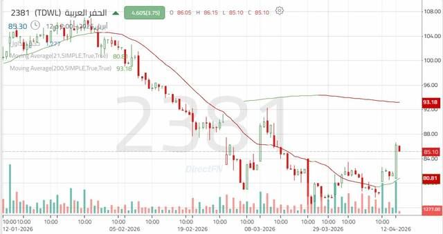 مباشر للأبحاث: أظهر سهم الحفر العربية تماسكه بالقرب من مستوى دعم 76.60 ريال، مع أحجام تداول نشطة.