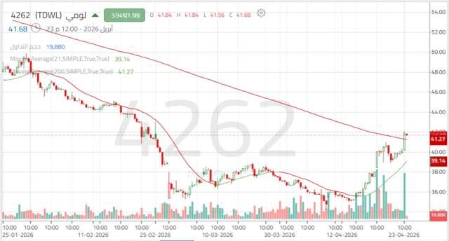 ويتداول السعر حالياً بالقرب من مستويات 41.60 ريال، وسيكون أقرب مستهدف للسهم حول منطقة 43.04 – 44.18 ريال، وفي حال استمرار الزخم الشرائي فسيكون المستهدف التالي بالقرب من 45.24 – 45.90 ريال.