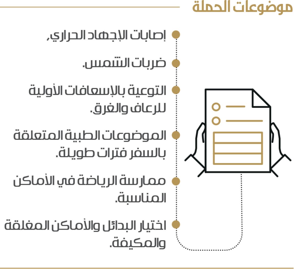 وأوضح التجمع الصحي أن الحملة التي تأتي بالتزامن مع موسم الصيف، وما يصحبه من ارتفاع لدرجات الحرارة، وما يُحدث الكثير من إصابات الإجهاد الحراري وضربات الشمس، إضافة إلى التوعية بالإسعافات الأولية للرعاف والغرق، نظرا للإقبال الكبير على المسابح خلال هذه الفترة.
