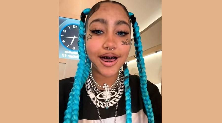 وظهرت نورث ويست، 12 عاماً، في سلسلة فيديوهات عبر منصة تيك توك بشعر أزرق مضفور ووشم نجمة أسفل عينها اليمنى، مع كتابة اسمها بخط مائل على خدها الأيسر، كما ارتدت شبكة أسنان سوداء، وثقباً مزيفاً في الأنف، وعدسات لاصقة ملونة، بحسب صحيفة نيويورك بوست.