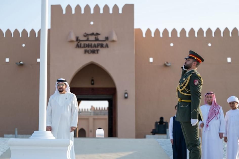 رفع سمو الشيخ حمدان بن زايد آل نهيان، ممثل الحاكم في منطقة الظفرة، علم دولة الإمارات العربية المتحدة في حصن الظفرة احتفالاً بيوم العلم، الذي يصادف الثالث من نوفمبر من كل عام.