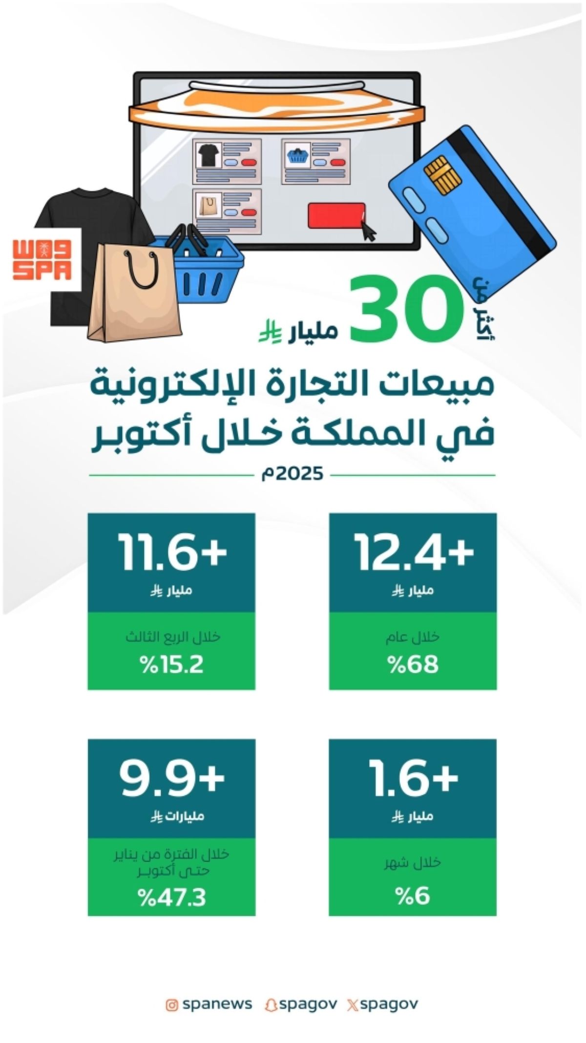 +30 مليار ريال مبيعات التجارة الالكترونية بالمملكة في أكتوبر, اليوم الأحد 28 ديسمبر 2025 11:31 مساءً