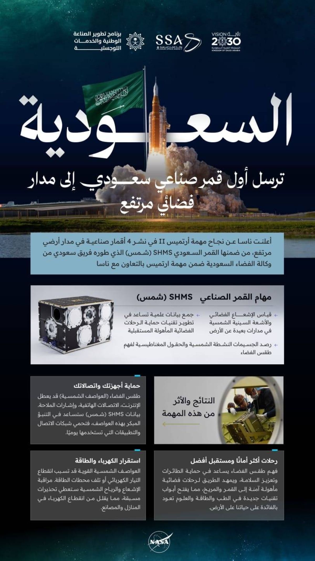 ويعد «شمس» إنجازا متعدد الأوائل؛ إذ يمثل أول مهمة عربية تطلق إلى الفضاء ضمن برنامج «آرتميس»، وأول مهمة وطنية متخصصة في رصد طقس الفضاء، بما يؤكد تقدم في القدرات الوطنية في التقنيات الفضائية المتقدمة. وقد جرى تطويره داخل المملكة بكفاءات وطنية، بدعم من مبادرات برنامج تطوير الصناعة الوطنية والخدمات اللوجستية، أحد برامج تحقيق رؤية السعودية 2030.